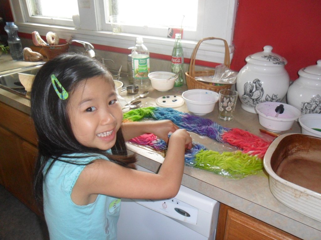 Kate came home and we worked on hers. She did great! I wasn't sure how long she would last since it's not a really fast process, but she stuck around for the whole thing. She calls the yarn her rainbow.
